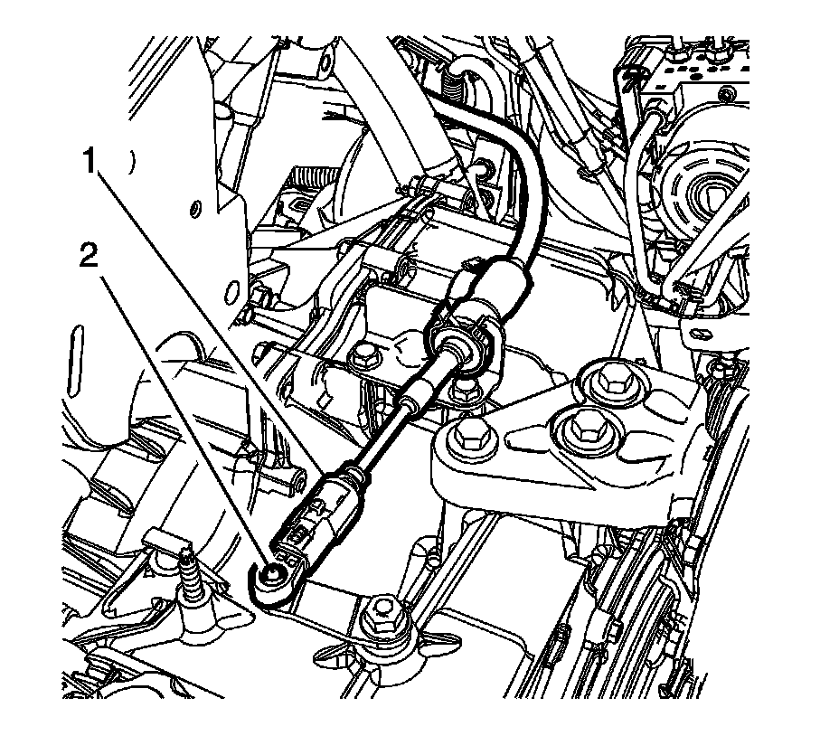 2. Disconnect the transmission range selector lever cable terminal (1) from the transmission manual shift lever pin (2).