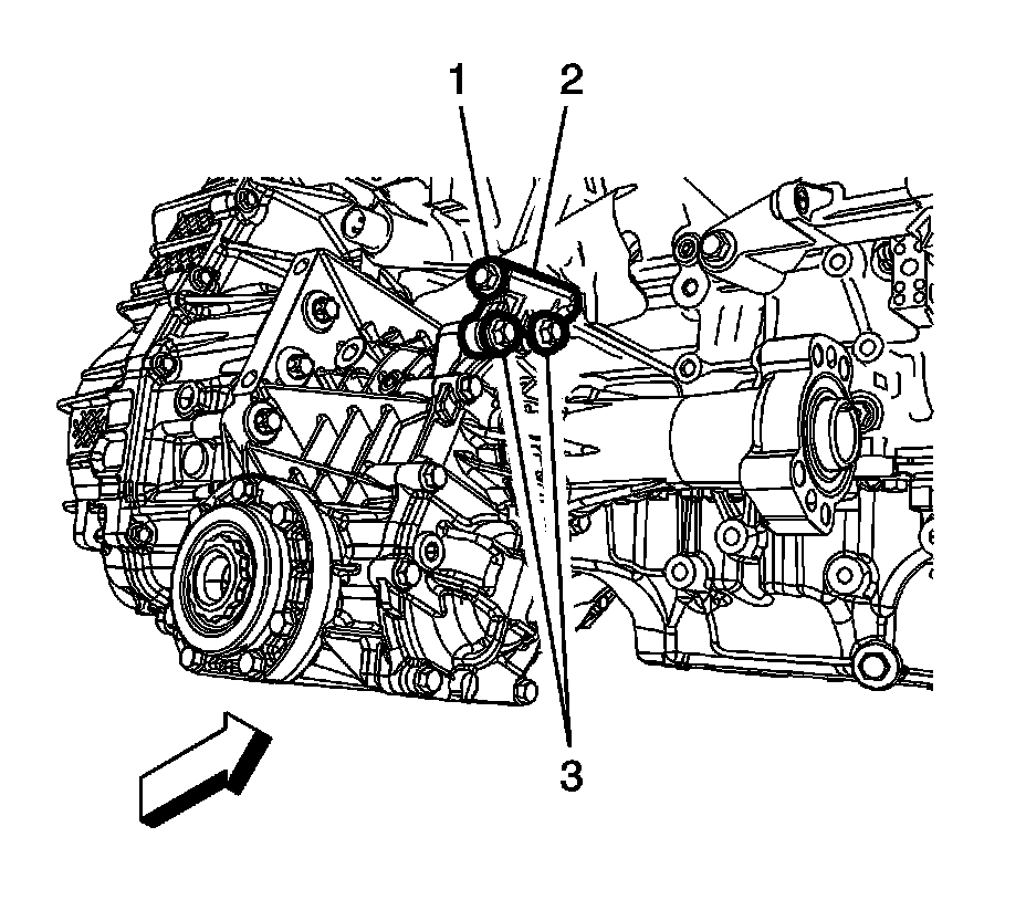 13. Install the transfer case vent hose (3), fastener (1), and bolt (2).