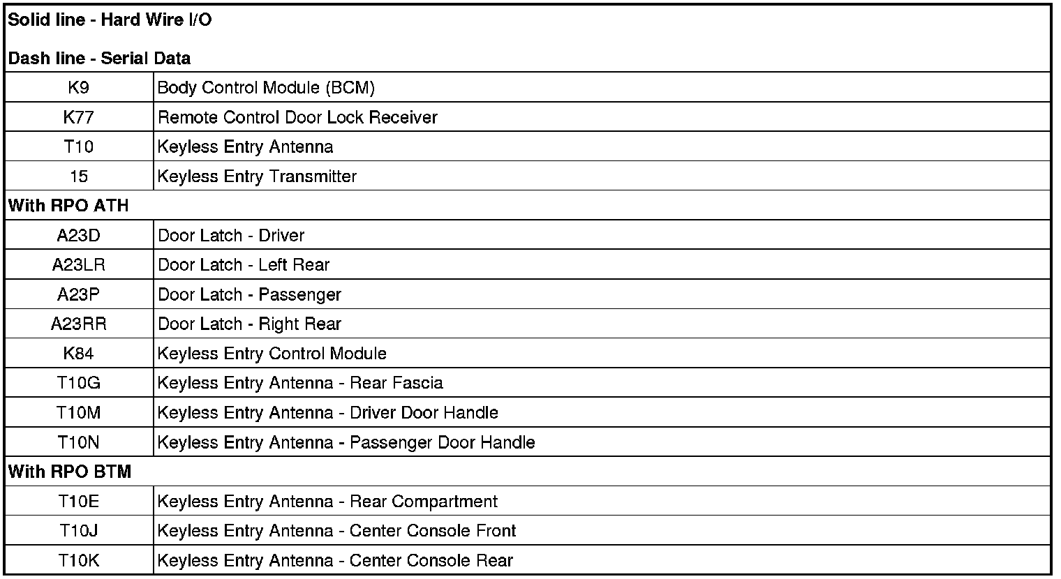 The keyless entry system is a vehicle entry device. The keyless entry system is used in conjunction with the door locks to unlock the vehicle. Keyless entry will lock/unlock a door or open the rear compartment lid when a corresponding button on the keyless entry transmitter is pressed. This is accomplished by the transmitter sending a radio frequency to the remote control door lock receiver antenna that has a direct link to the body control module (BCM). The BCM interprets the signal and activates the requested function or request the appropriate ECU to activate the function via a serial data message. A low transmitter battery or radio frequency interference from aftermarket devices, such as 2-way radios, power inverters, computers, etc., may cause a system malfunction. High radio frequency traffic areas, such as gas stations that use pay-at-the-pump radio frequency transponders, may also cause interference that could lead to a malfunction. Keyless entry allows you to operate the following features: