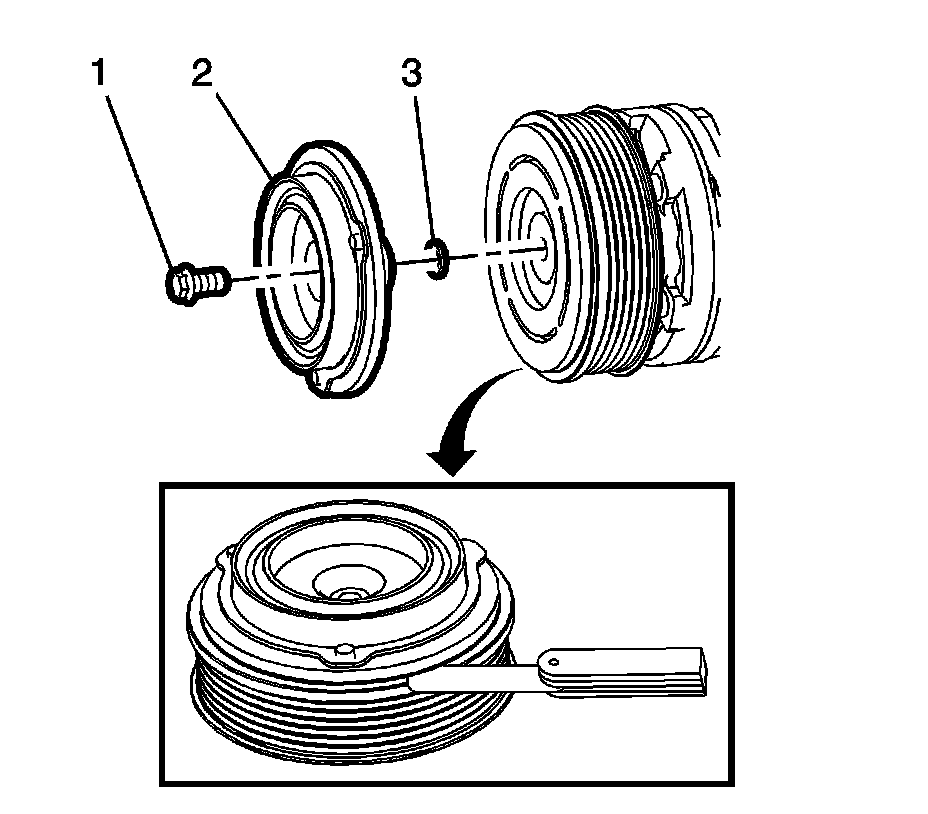 2. Measure the air gap between the pulley and the drive plate. Adjust the shims (3) to achieve a 0.21-0.55 mm (0.008-0.022 in) air gap.