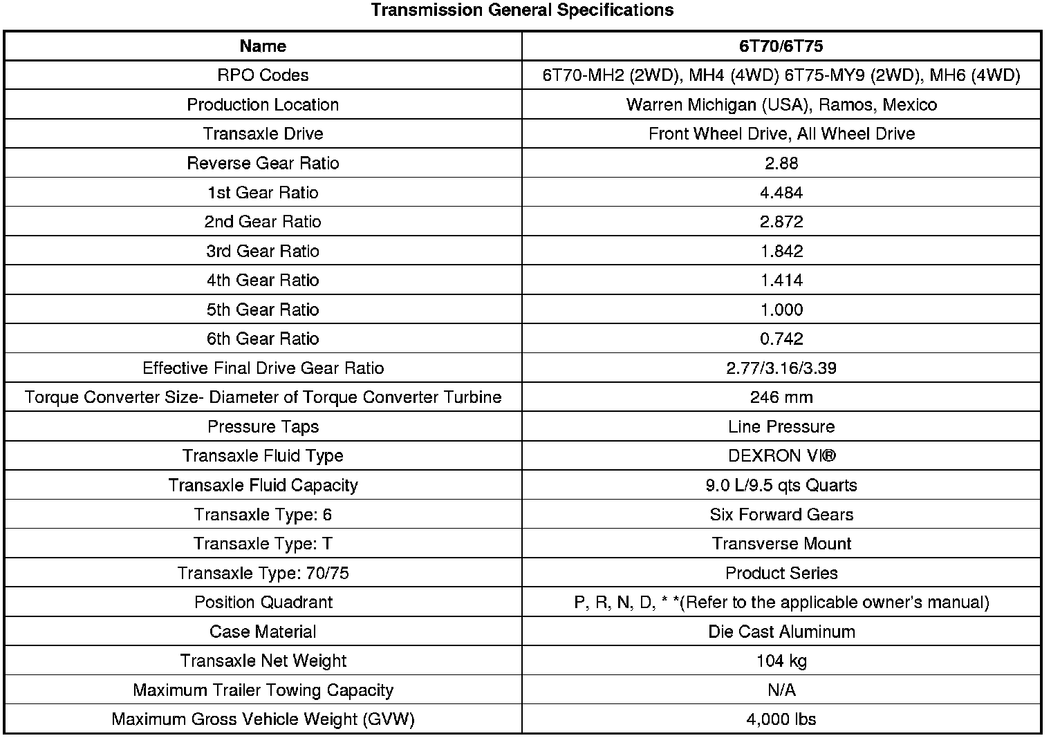 Transmission General Specifications