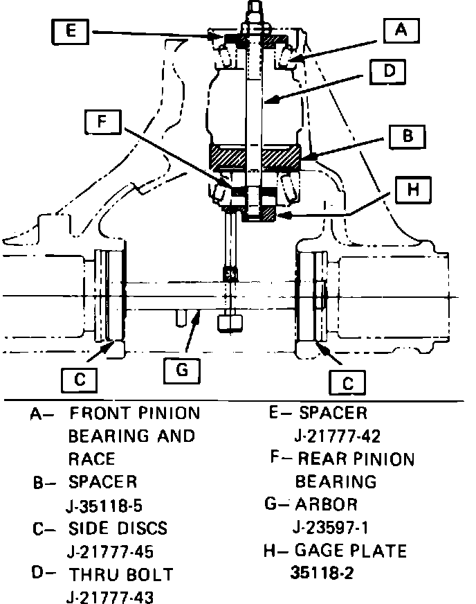 3. Slide rear pinion bearing and cap (F) onto thru bolt (D) and rear bearing into axle housing.