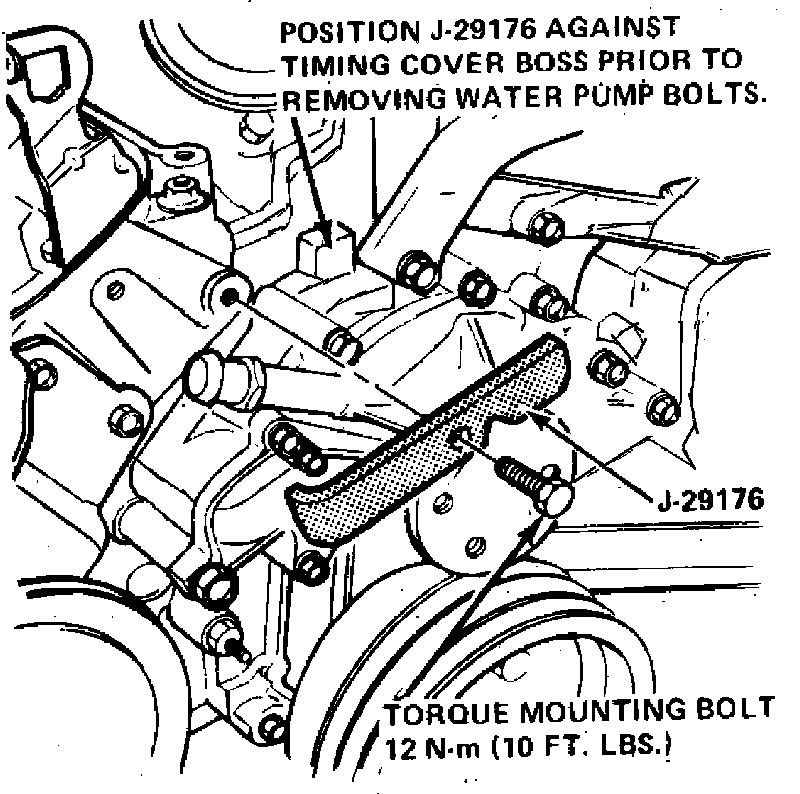7. Remove tool J-29176, then install water pump pulley and drive belts and connect heater hose to pump.