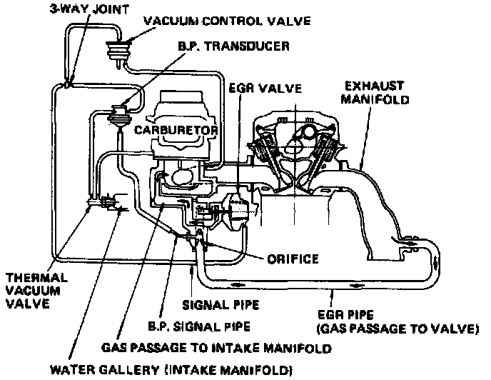 This system, Figs. 14, 15, 16 and 16A, is used to reduce oxides of nitrogen emissions by lowering the peak combustion temperature in the engine. This is accomplished by introducing a metered amount of exhaust gases into the intake manifold at throttle positions other than idle.