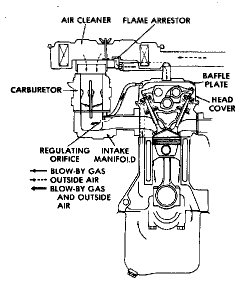During normal engine operation, blow-by gases and fuel vapor emitted from the fuel tank are mixed in the engine with fresh air supplied from the air cleaner. Oil particles are separated from this mixture by the baffle oil separator located on the camshaft carrier side cover, or built into the center of the head cover. The blow-by gases are then drawn through the regulating valve or regulating orifice, through the intake manifold, into the engine for reburning.
