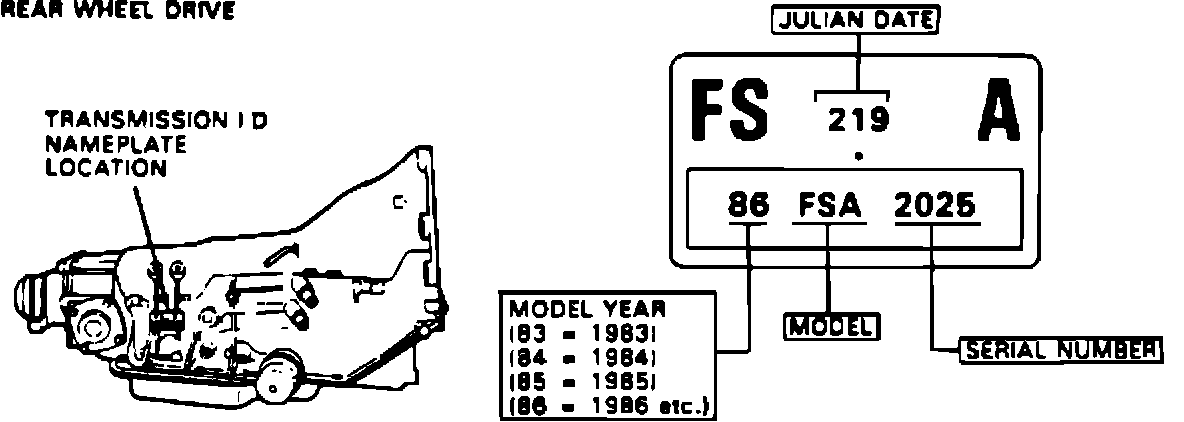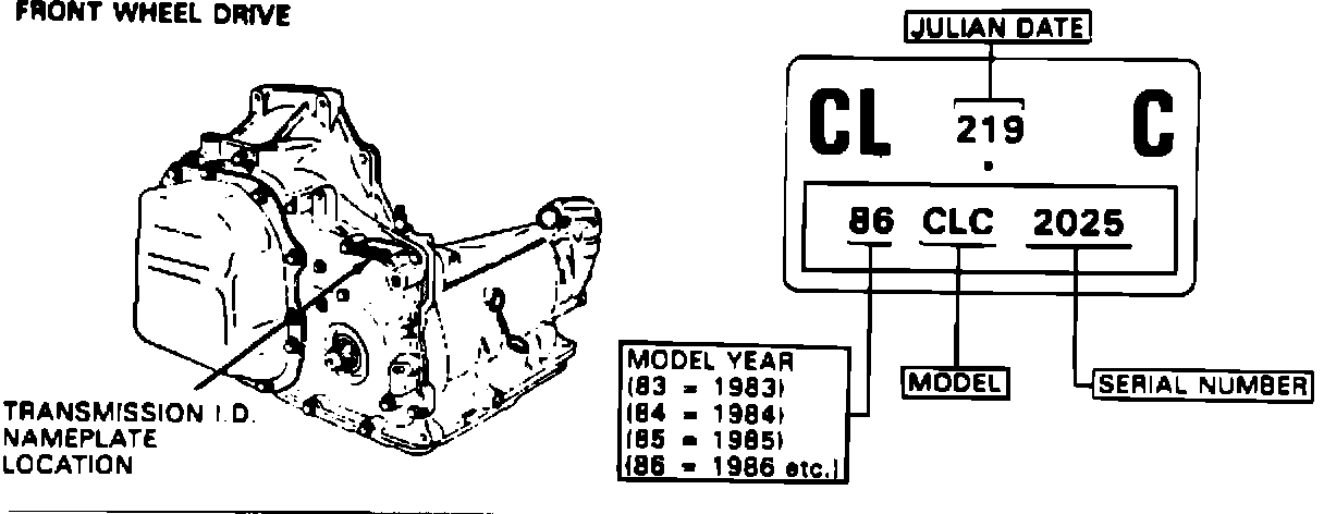 The transmission identification tag or stamped identification contains such information as transmission type, model year, model, serial number, and Julian date.