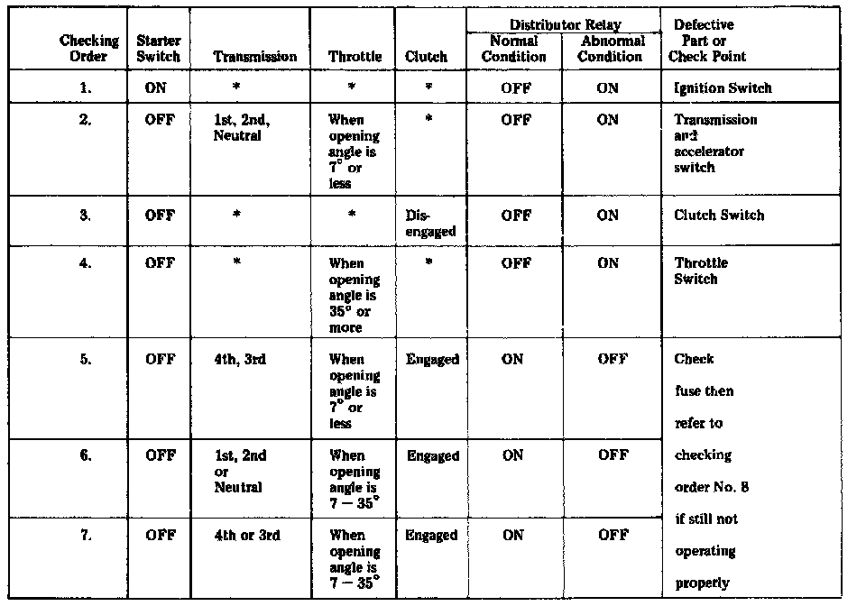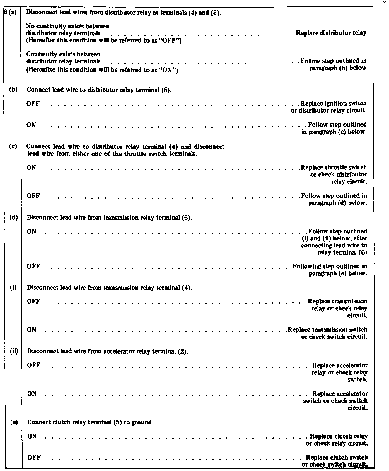 Testing of this system is accomplished by performing a continuity test on the distributor relay. Disconnect lead wire from distributor relay terminal (retarded contact breaker points) and connect tester to terminal and ground. Turn ignition switch on (engine off) and follow procedure shown in Figs. 19 and 20.