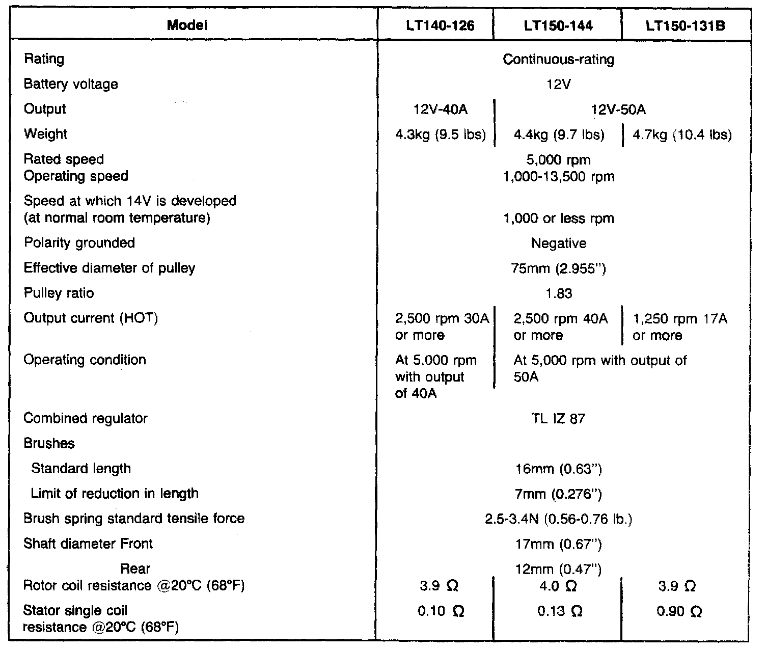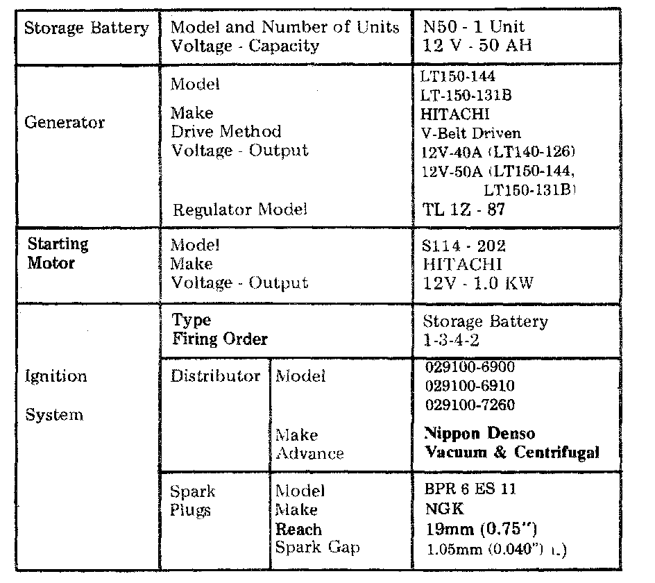 Starting and Charging: Specifications
