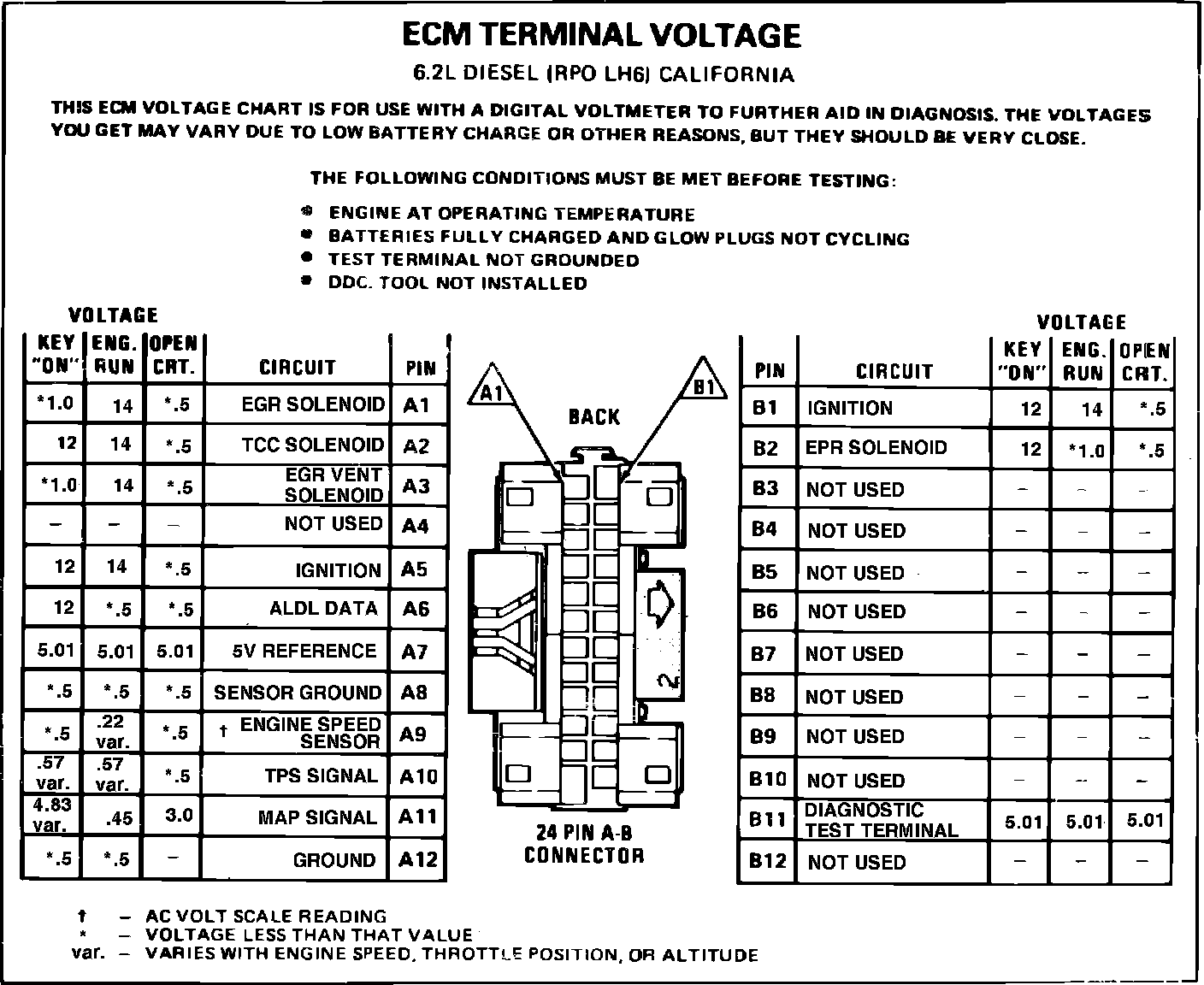 Fig. 7 ECM connector terminal identification & voltage specifications. 1984:
