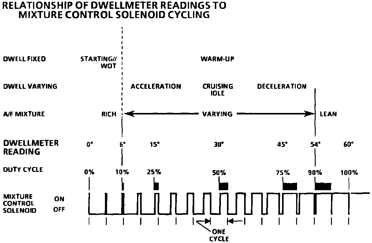 1. Checks for ability of carburetor main metering system to change the Air/Fuel mixture. Disconnecting M/C solenoid makes carburetor operate full-rich and reconnecting it with the dwell lead grounded makes it operate full-lean. Normal response - RPM drops as M/C solenoid is reconnected. Usually 400-1000 RPM, but should be at least 300 RPM.