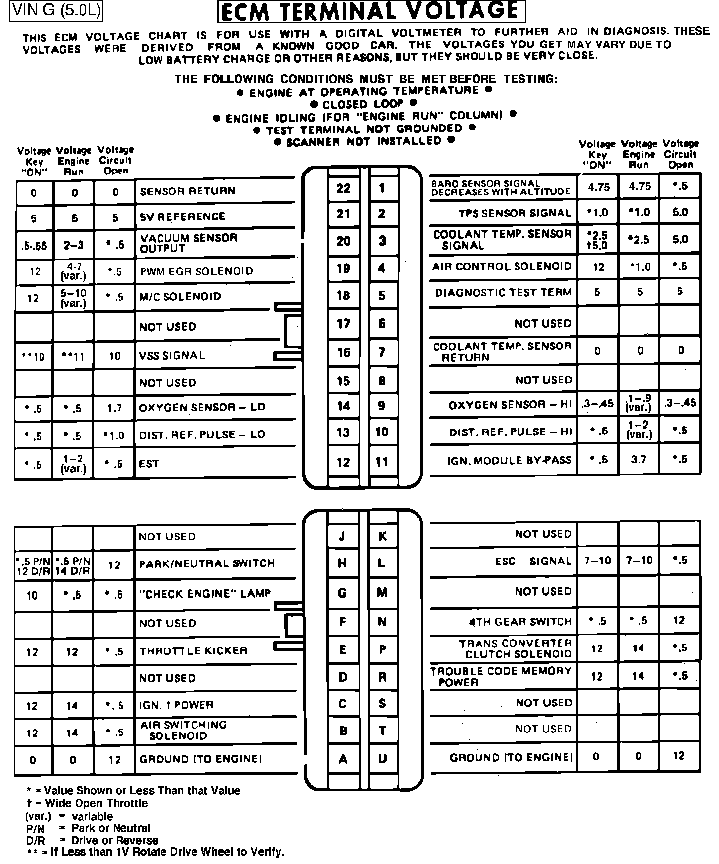 Fig. 029 - ECM Connector Terminal Identification & Voltage Specifications.: