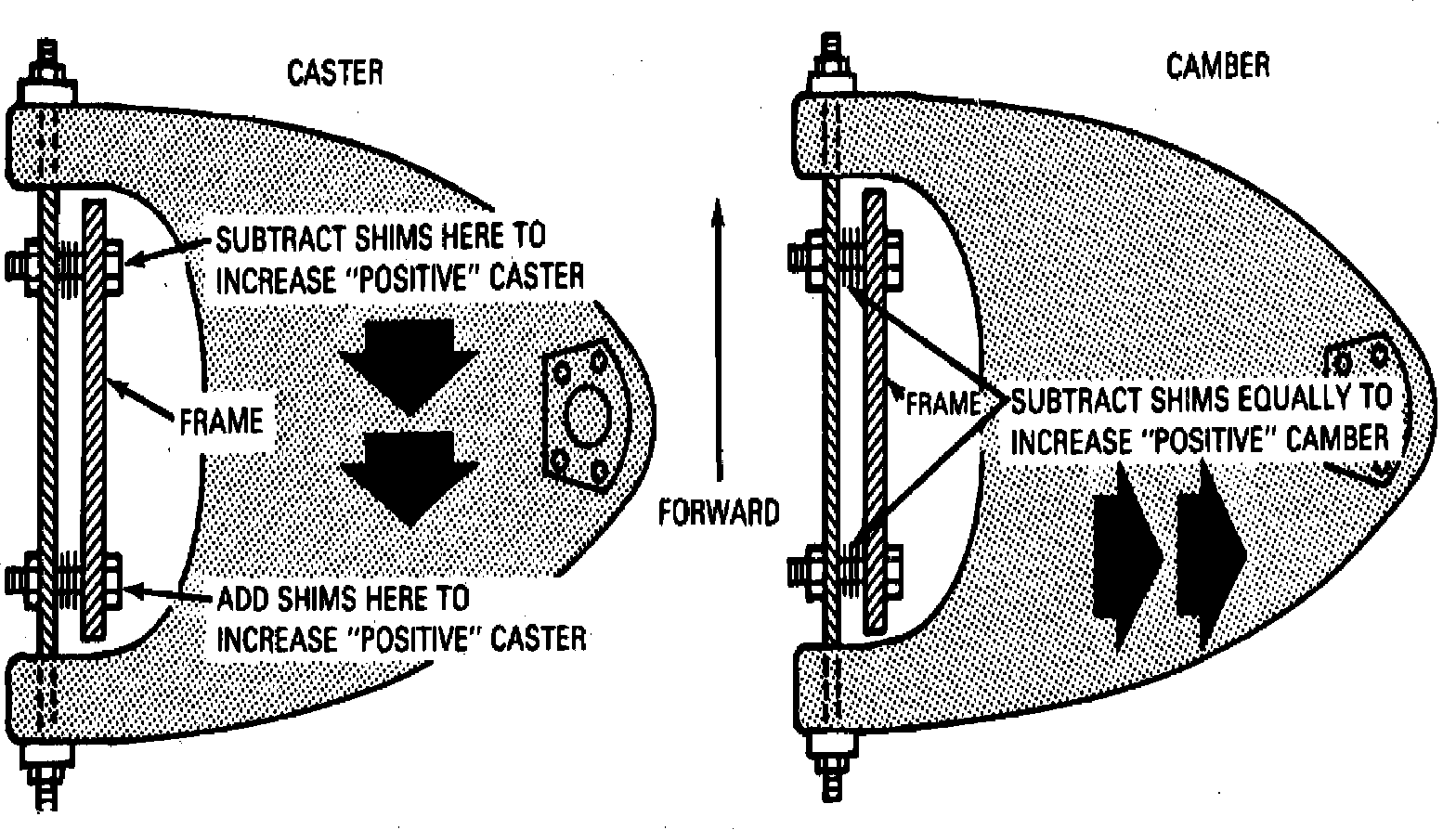 Change shims at both the front and rear of the shaft. Adding an equal number of shims at both front and rear of the support shaft will decrease positive camber. One shim (1/32 inch) at each location will move camber approximately 1/6 degree.
