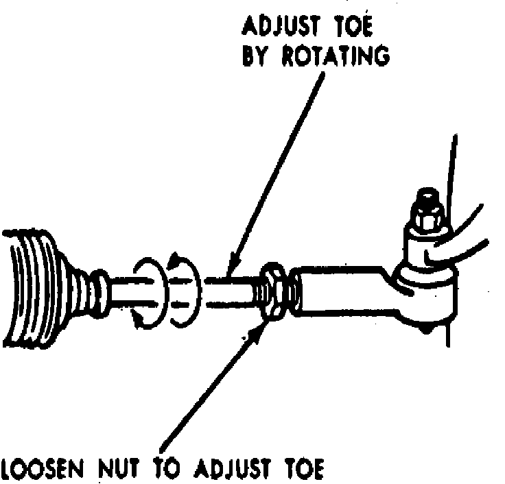 Toe-in can be adjusted by loosening the clamp bolts at each end of each tie rod and turning each tie rod to increase or decrease its length as necessary until proper toe-in is secured and the steering gear is on the high point for straight-ahead driving. Fig. 6.