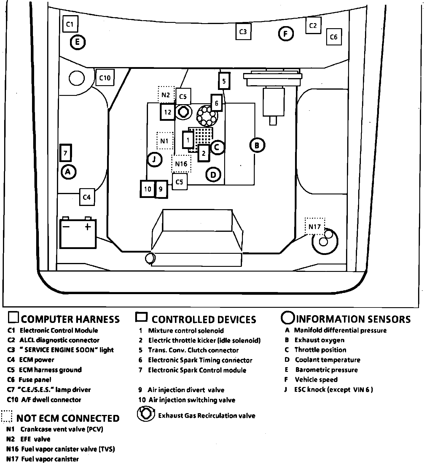 Fig. 29 Emission Component Location. 1985 Monte Carlo, Caprice & Impala W/V8-305/5.0L, 4 Bbl. 1985 Caprice Classic & Impala W/V8-350/5.7L 4 Bbl: