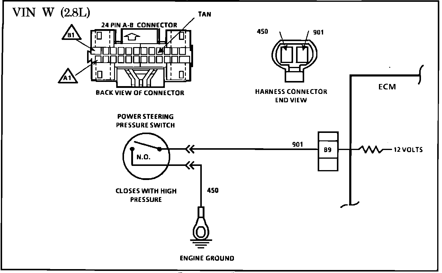 The power steering pressure switch is normally open to ground, and circuit 901 will be near battery voltage.