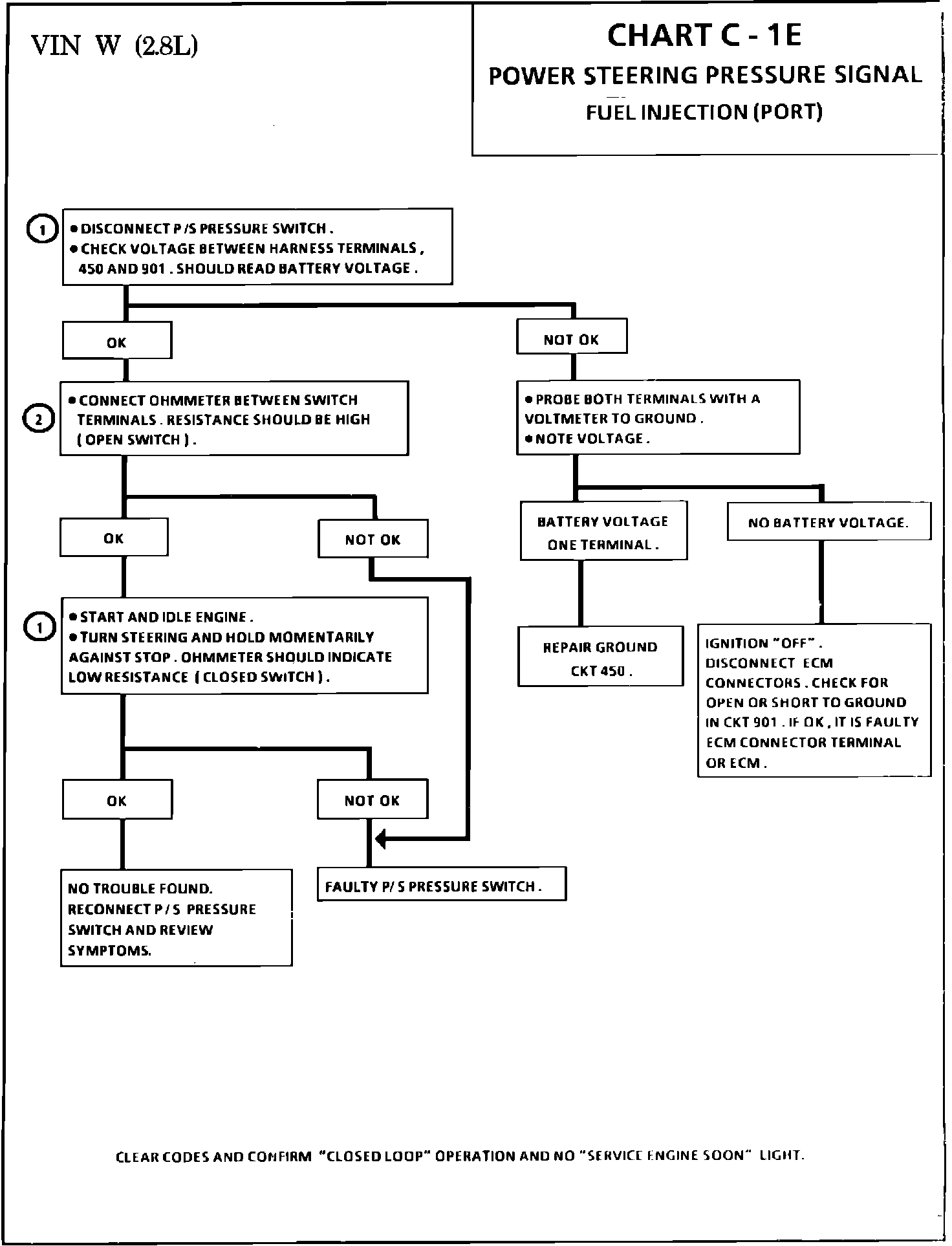 1. Checks for ECM signal voltage on CKT 901, and confirms that ground CKT 450 is OK. Optional test for A/C equipped vehicles: With clutch on, turn the steering wheel against stop. If P/S pressure switch is functioning properly the clutch should disengage.