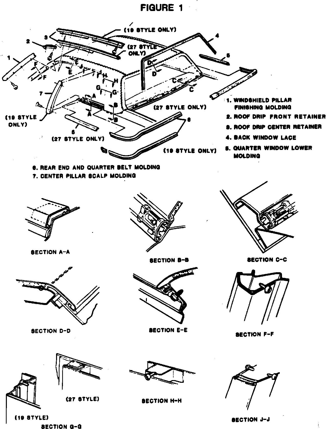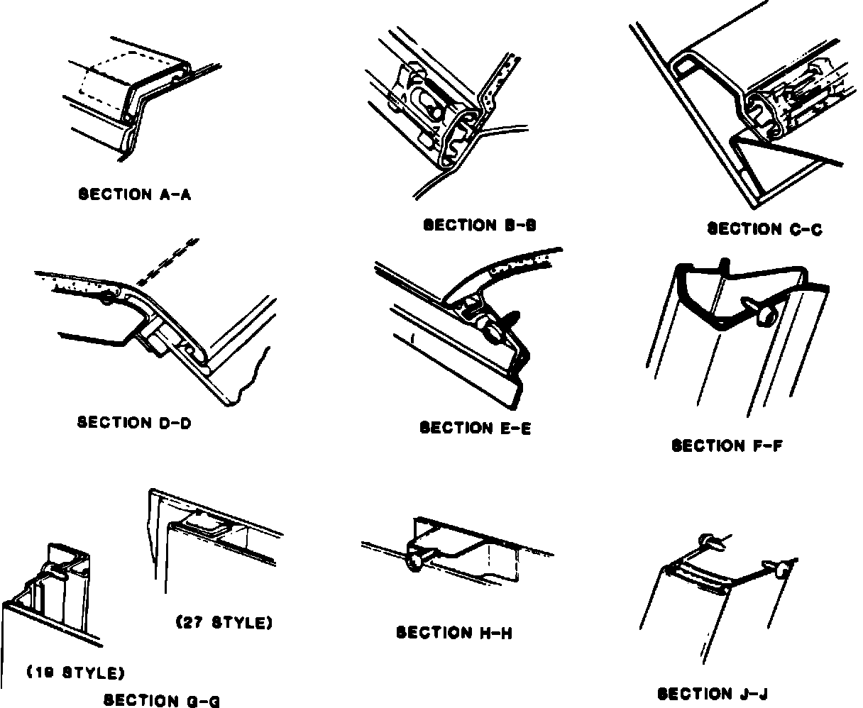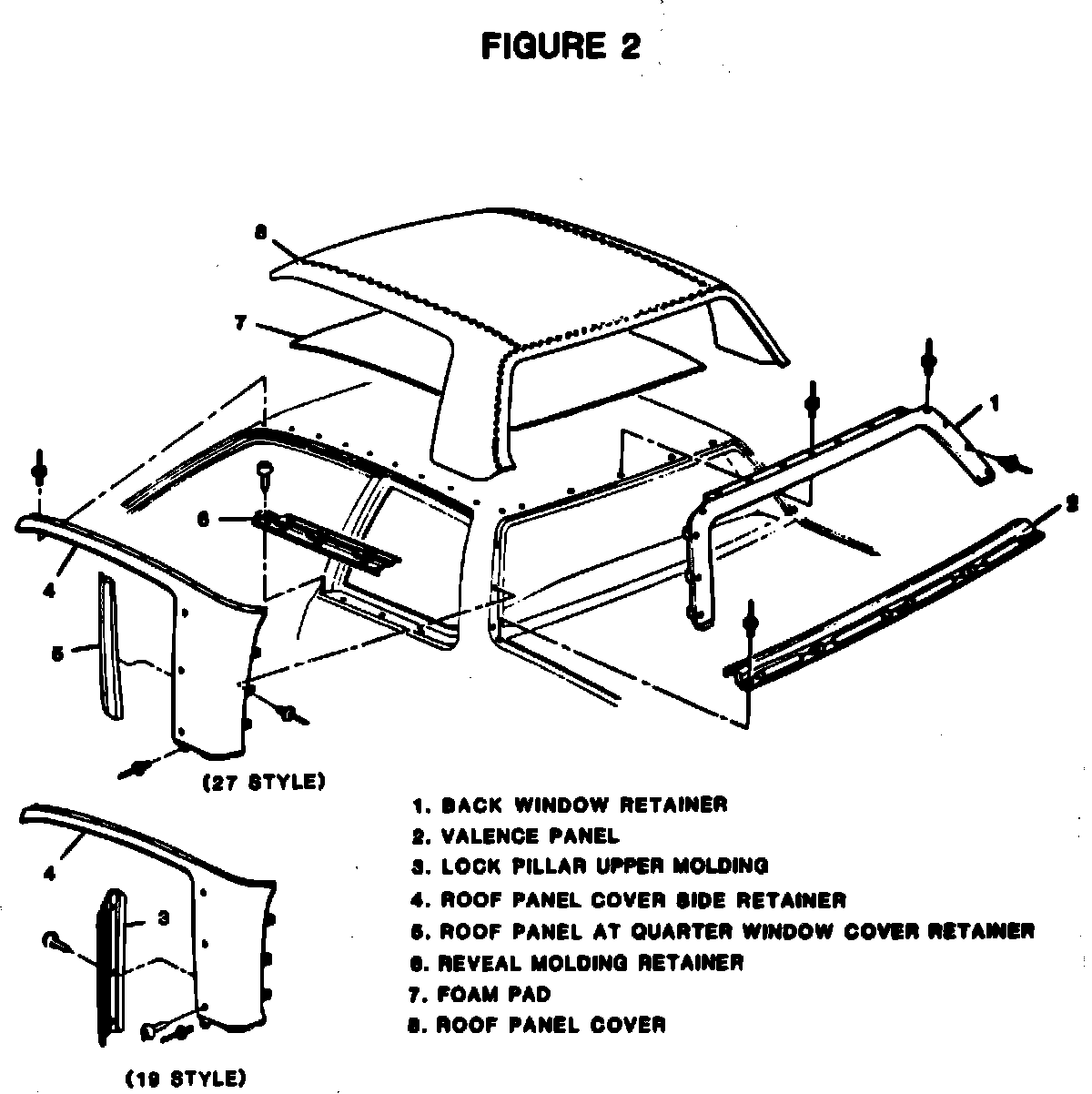 12. Back window lace, valence panel, rear end and quarter belt moldings, roof drip front and center retainers, windshield pillar finishing molding and on 19 styles only, center pillar scalp molding. On 27 styles, install roof panel at quarter window cover retainer (5, Fig. 2).
