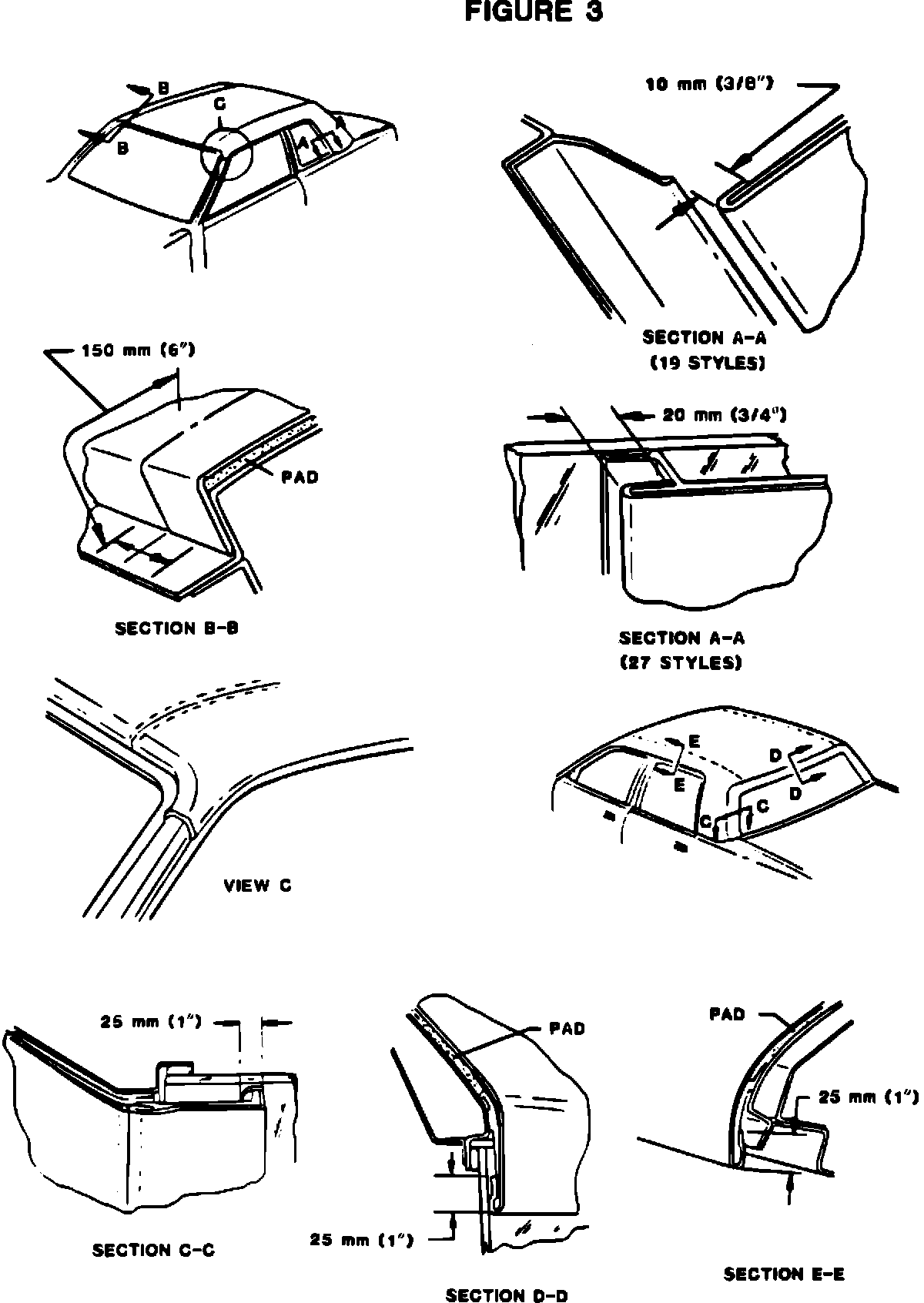 9. Trim top along windshield and back window and along roof panel cover side retainers. Ref. sectional views of Fig. 3.