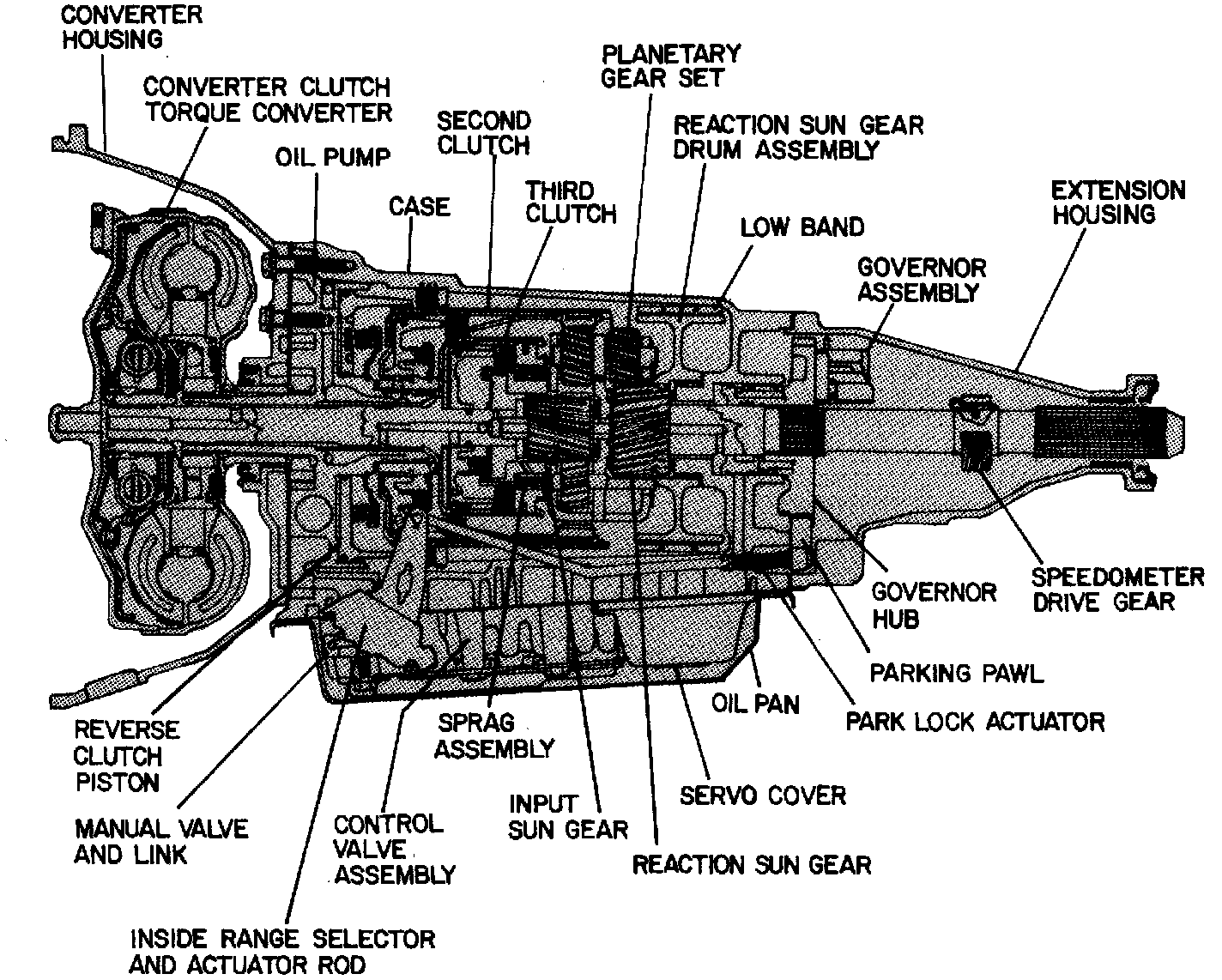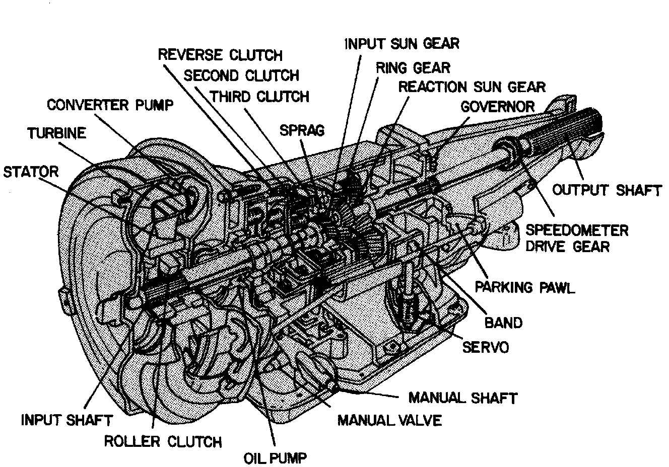 This transmission is a fully automatic unit consisting primarily of a three-element hydraulic torque converter and a compound planetary gear set, see image. Three multiple disc clutches, a roller clutch and a band provide the friction elements required to obtain the desired function of the compound planetary gear set The compound planetary gear set provides three forward speeds and reverse.
