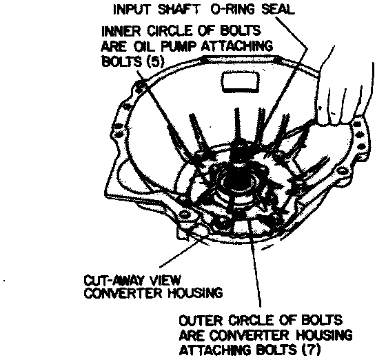 13. Remove the outer seven converter housing attaching bolts. Loosen, but do not remove, the inner five oil pump bolts, see image.