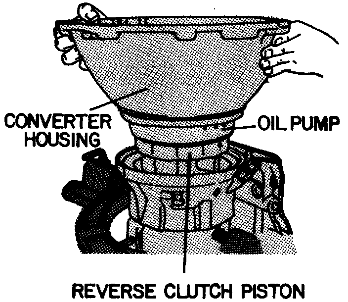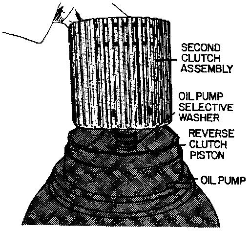14. Remove the converter housing together with oil pump, reverse clutch and second clutch assemblies, see first image. Do not lose selective thrust washer, located between oil pump and second clutch drum, see second image. If the second clutch assembly remains in case, remove assembly with the reverse clutch plates. Observe the position of square-cut oil seal. Be sure to install new seal in the same position during assembly.