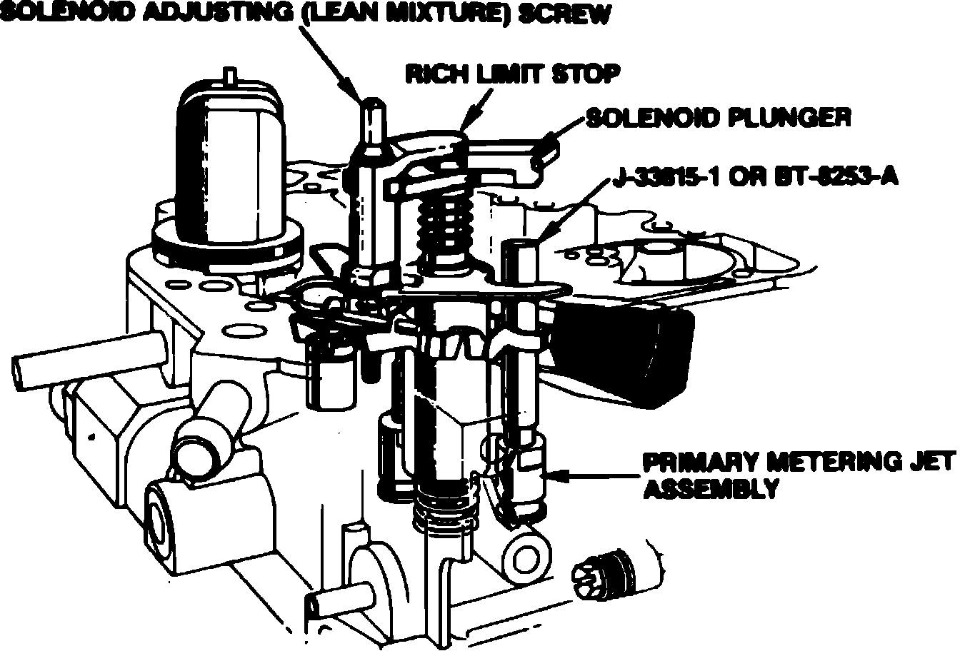 7. Install adjusting screw spring, MC solenoid, filler block, metering rods and springs, solenoid plunger, rich limit stop and adjusting screw.