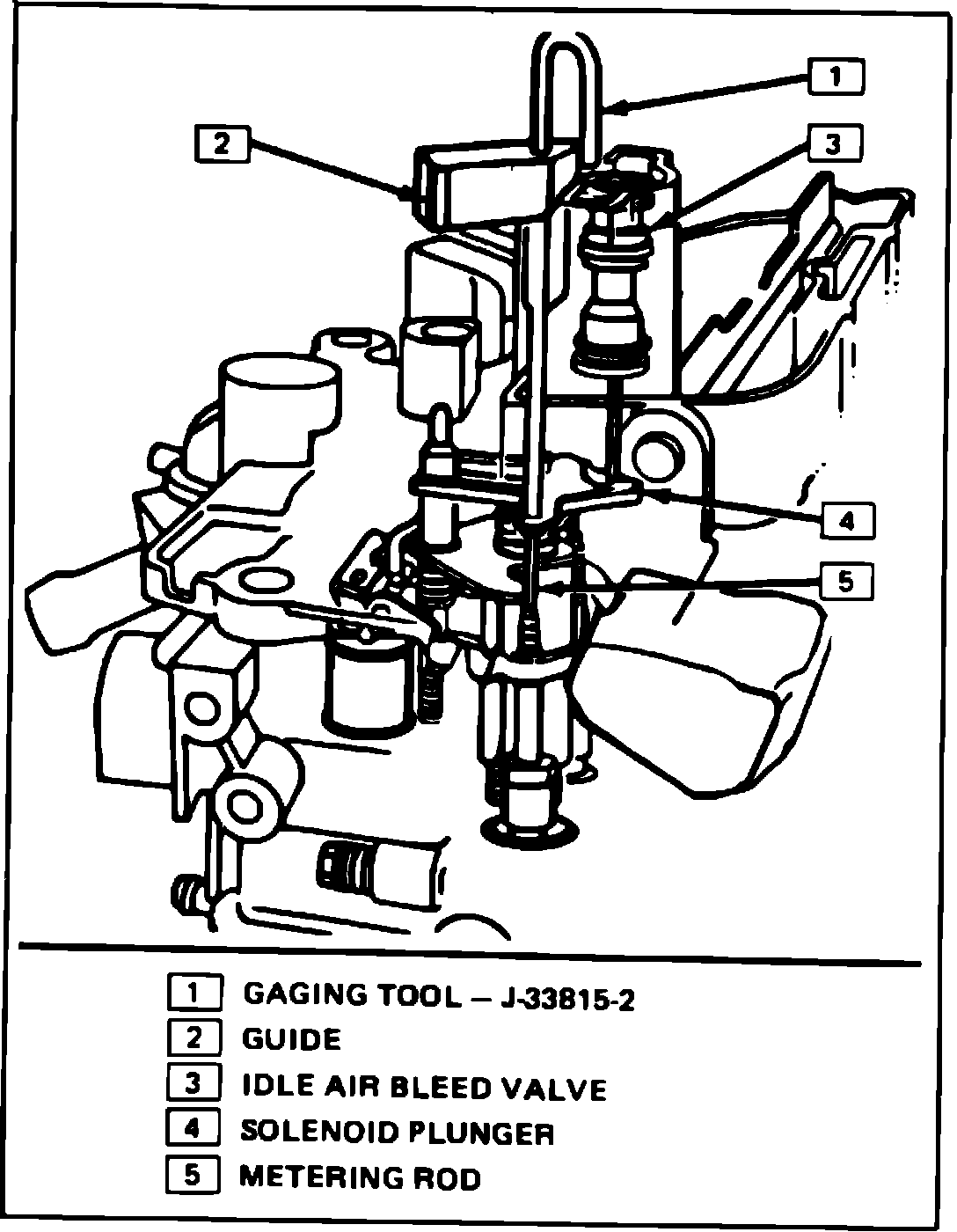 1. Install gauging tool J-33815-2, BT-8253-B or equivalent in ``D'' shaped hole on throttle side of air horn, with end of tool positioned above open cavity next to idle air bleed valve.