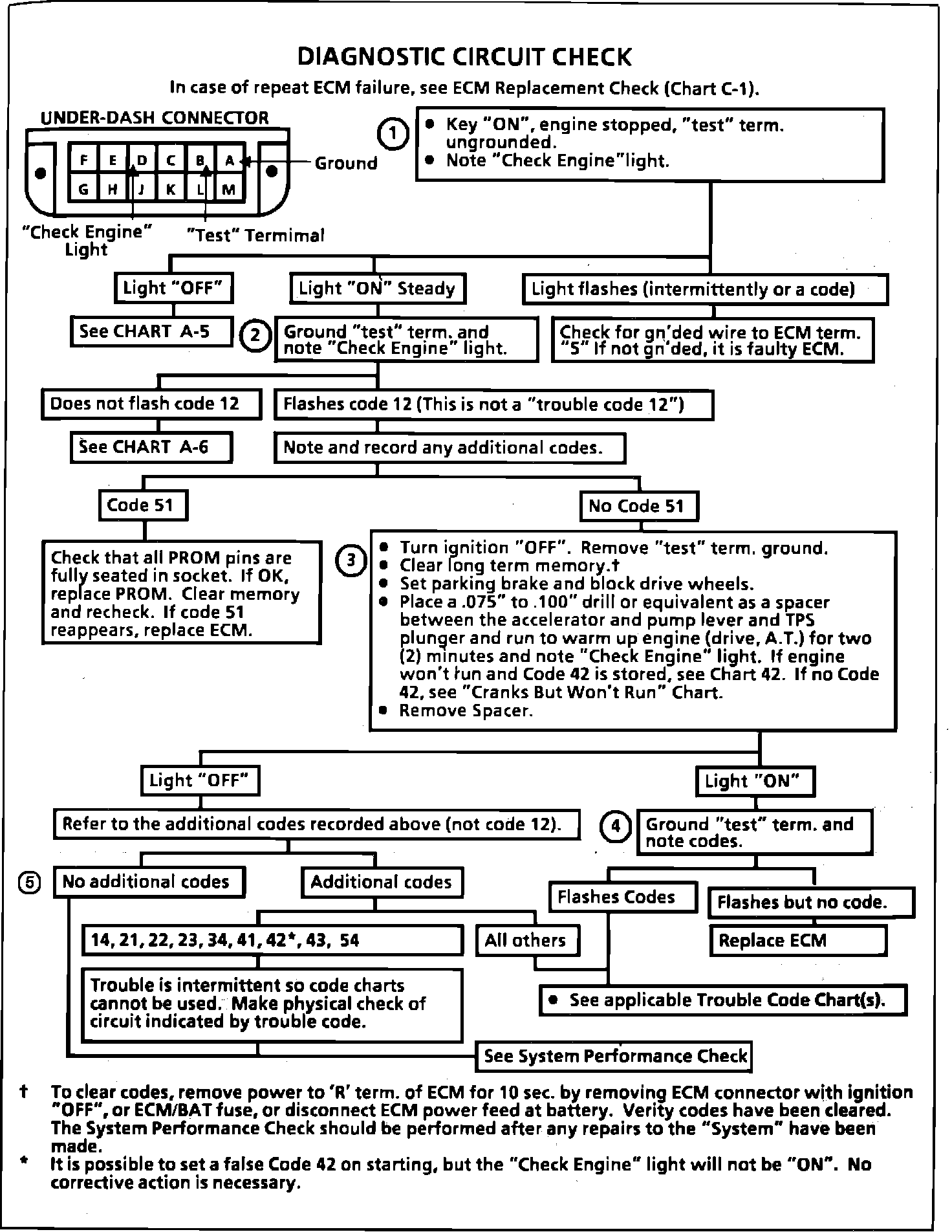 2. Grounding the test terminal will flash a Code 12 and any stored trouble codes. The light must go "ON" and "OFF" for a proper code. If the light goes from "Bright" to "Dim" this is not considered a code. See Chart A-6 in that case.