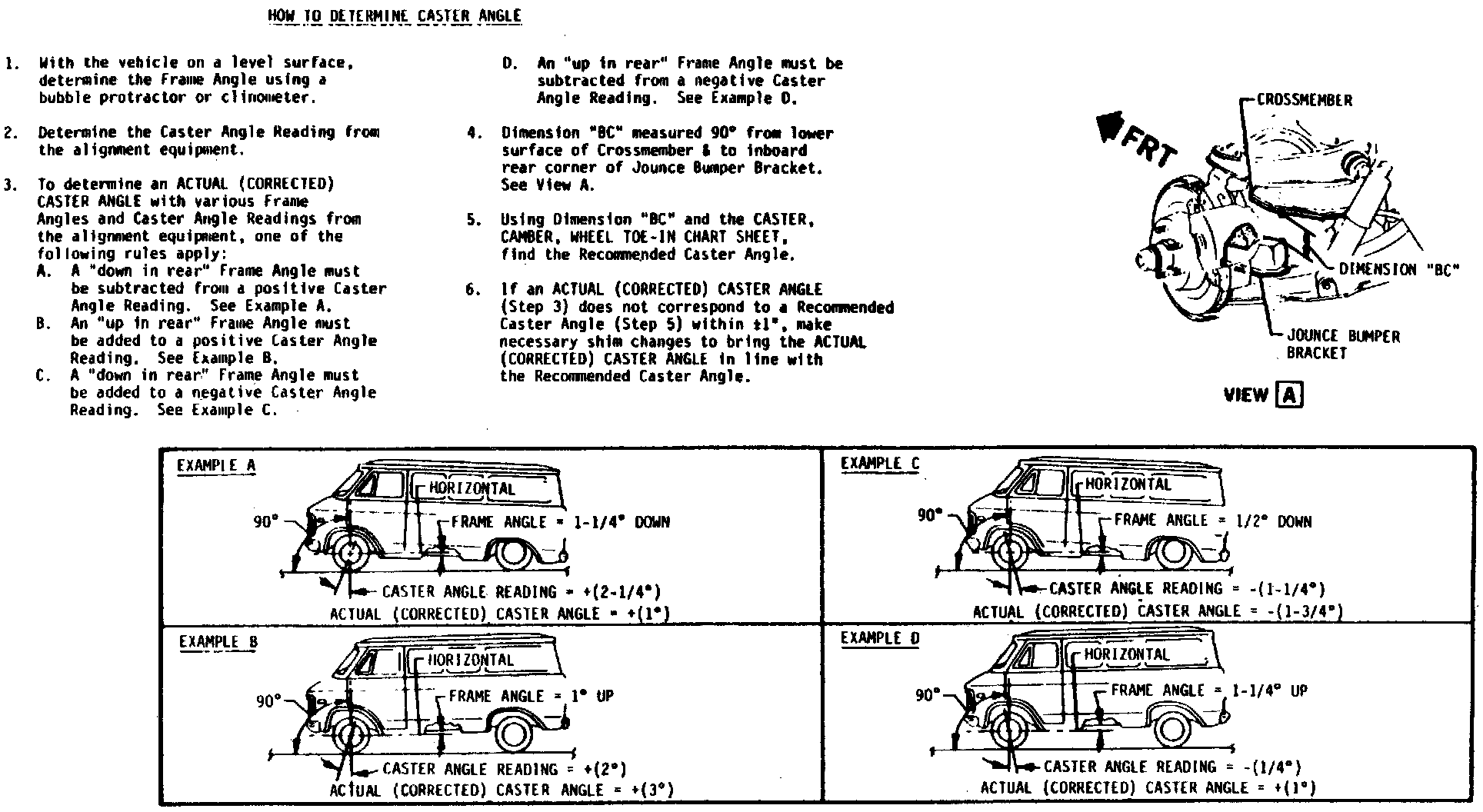 All caster specifications are given with a frame angle of zero. Therefore, it will be necessary to know the angle of the frame (whether "up" in rear or "down" in rear) before a corrected caster reading can be determined (Figure 1).