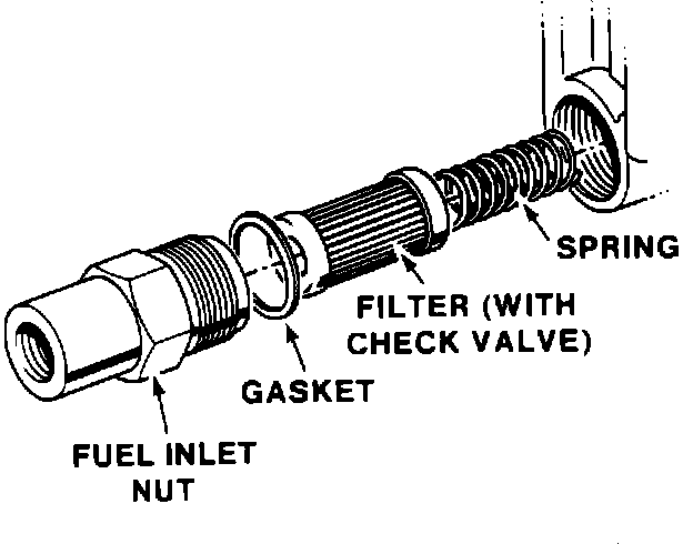 5. Install fuel inlet filter spring, filter, and check valve assembly in carburetor. Check valve end of filter faces toward fuel line. Ribs on closed end of filter element prevent filter from being installed incorrectly unless forced.