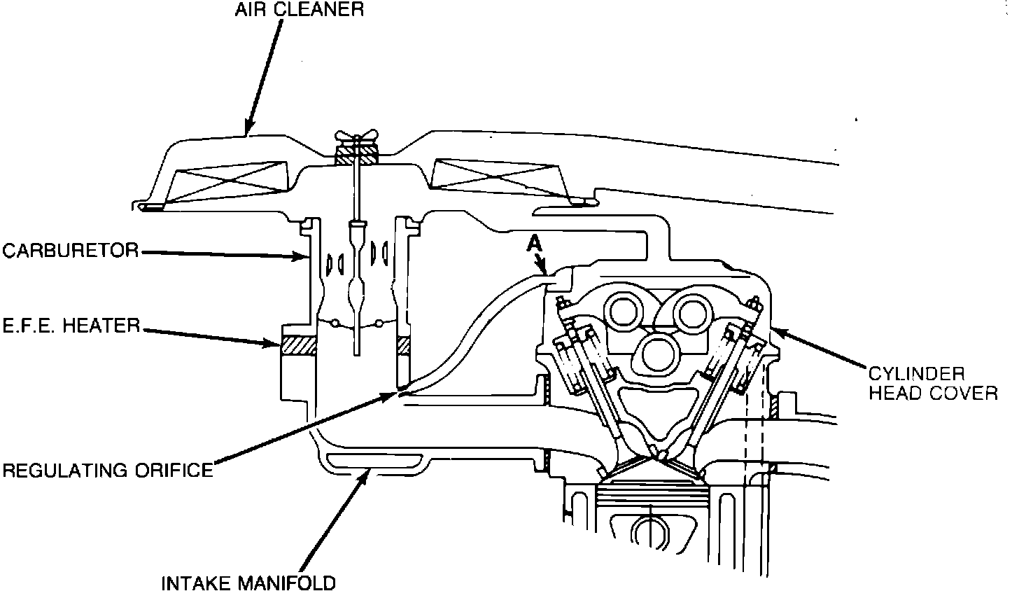 To prevent future occurrence of this condition, the 1987 model vehicle incorporates a revised PCV system utilizing a PCV valve located in the cylinder head cover (at "A" in Figure 1) and eliminates the regulating orifice in the intake manifold.
