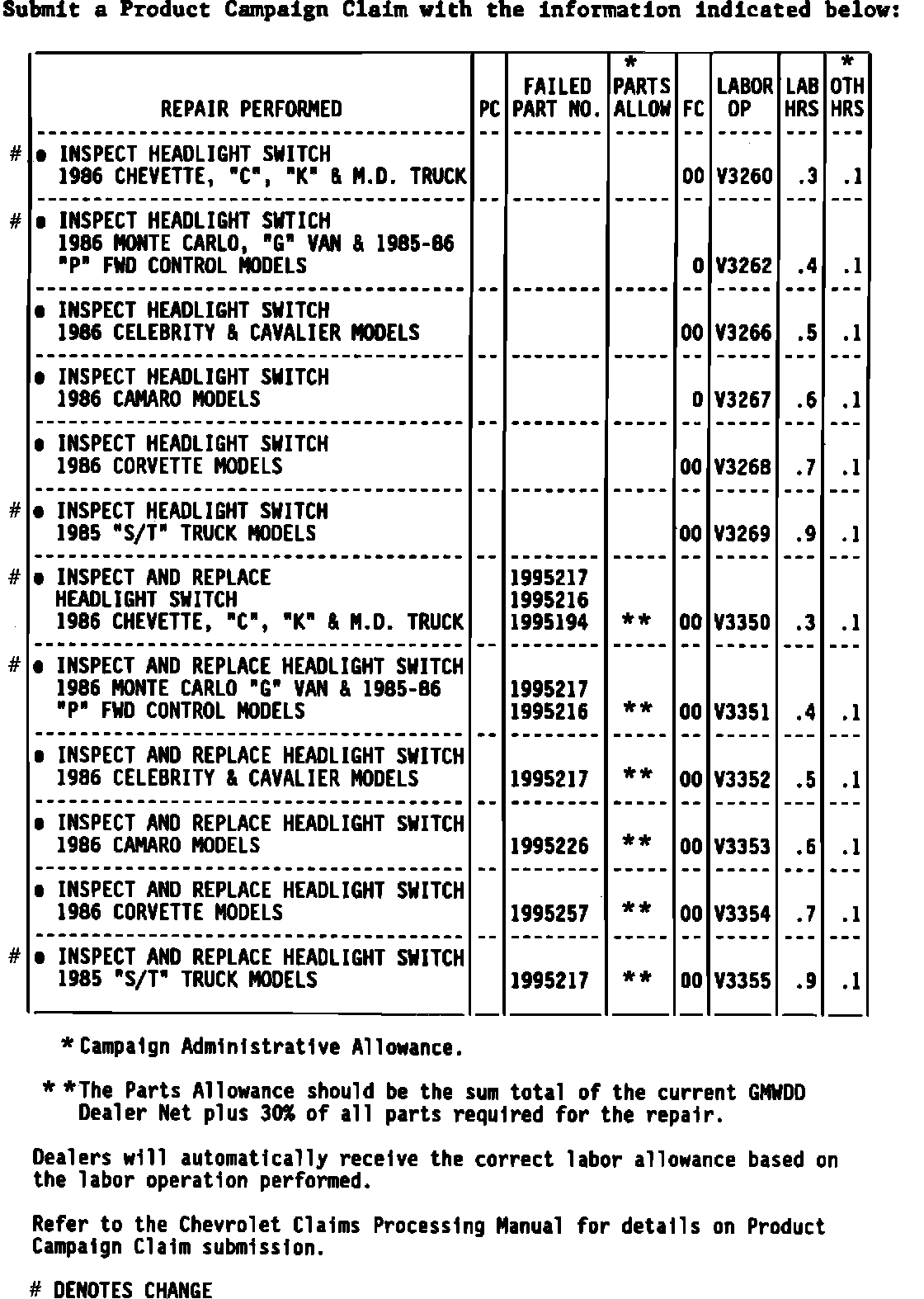 Instructions have been sent to your Chevrolet dealer. It is estimated that parts will be available October 1, 1986. The labor time to check the headlight switch and replace it, if necessary, is about 35 minutes. Please ask your dealer if you wish to know how much additional time will be needed to process your vehicle.