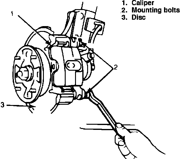 3. Remove caliper from knuckle, taking care not to drop inside pad. Hang caliper aside.