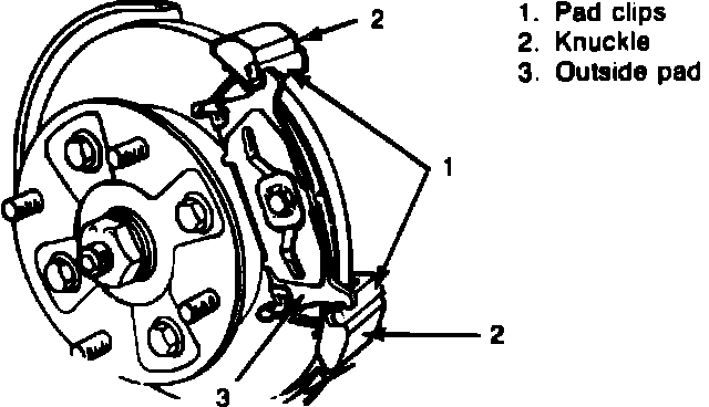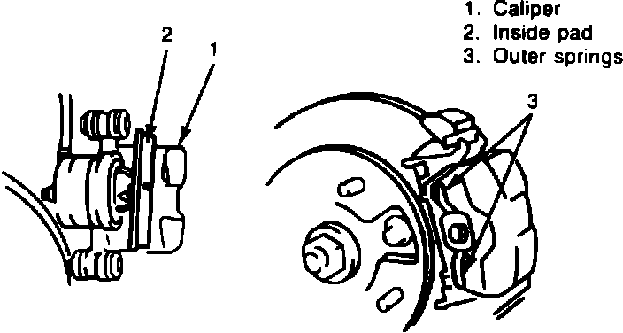 6. Install caliper and inside pad to knuckle, Fig. 6. Position outer springs over caliper as shown.