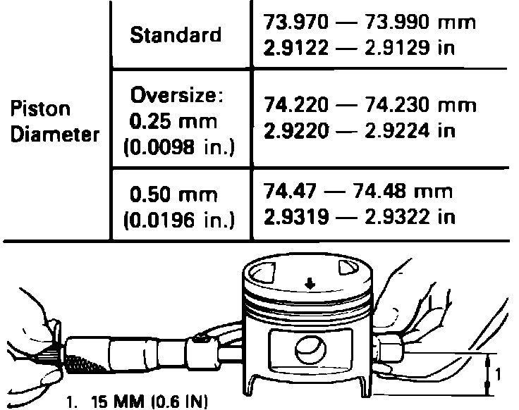 2. Measure piston diameter at a height of .59 inches (15 mm) from piston skirt end in perpendicular direction to piston pin, Fig. 17.