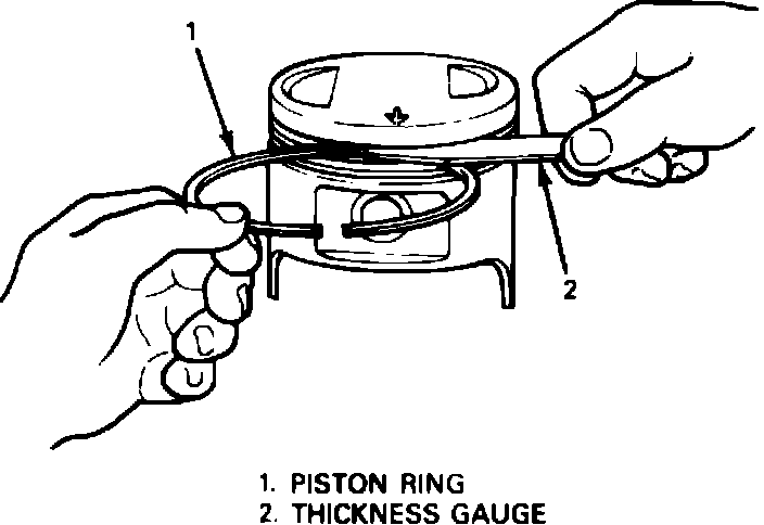 4. With piston grooves clean, dry and free of carbon, insert piston ring into groove, and measure clearance between ring and ring land with feeler gauge, Fig. 19. If clearance is out of specification, replace piston.