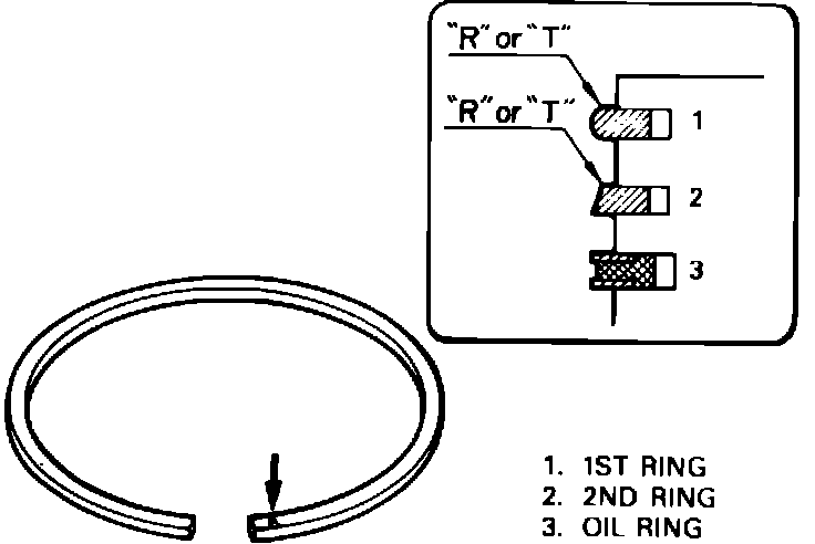 3. Install piston rings so marked side of each ring faces top of piston, Fig. 25. Note shape of rings 1 and 2.