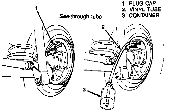 7. When bubbles stop, depress and hold brake pedal and tighten bleeder plug then attach bleeder plug cap.