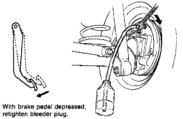 4. Depress brake pedal several times, and then while holding it depressed, loosen bleeder plug about one third to one-half turn.