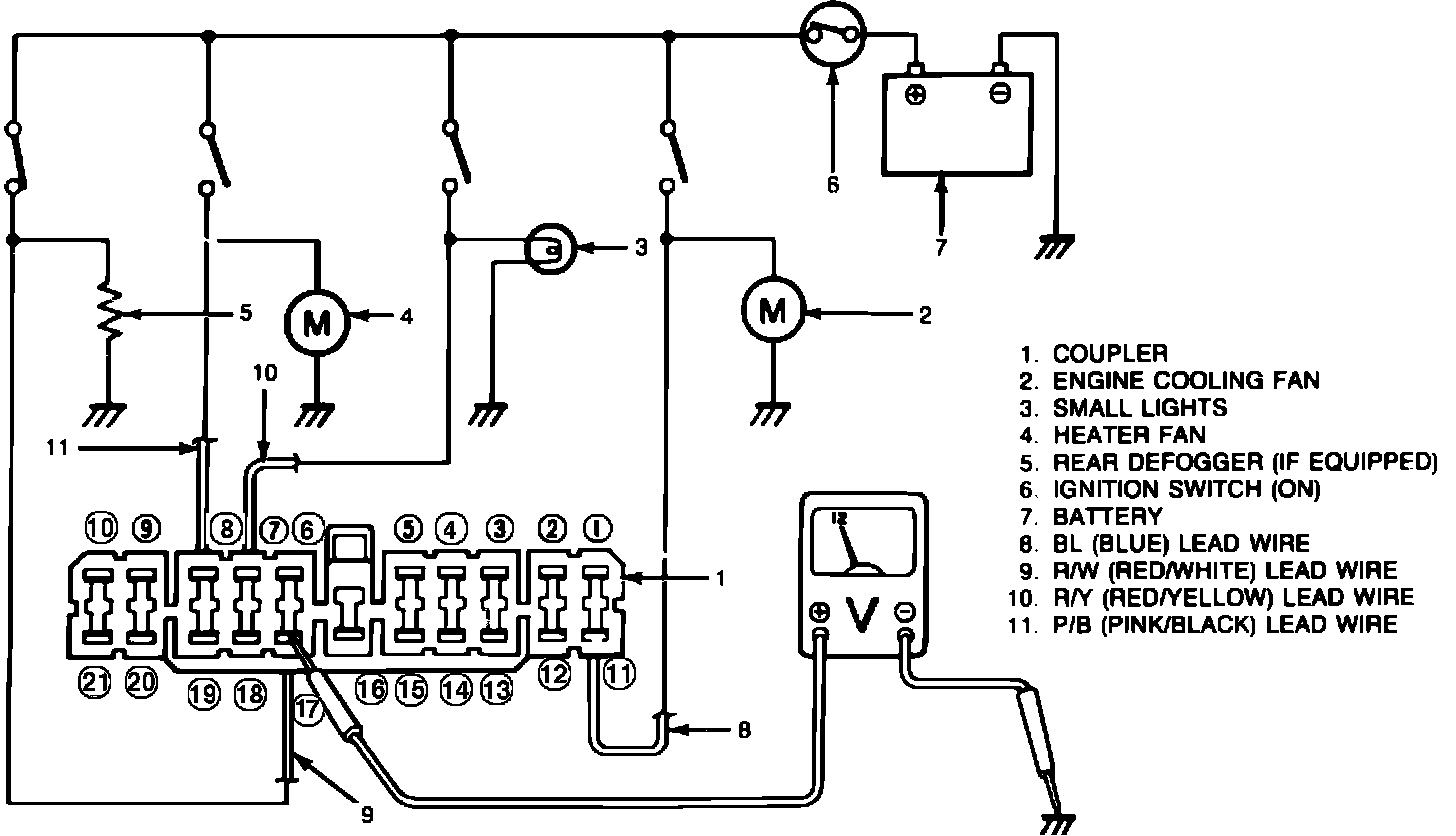 2. Switch on ignition without starting engine, then connect voltmeter between terminal 7 and body ground as shown in Fig. 35.