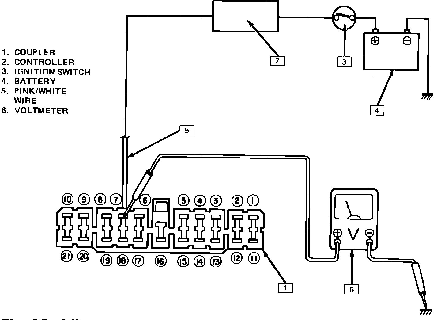3. Connect voltmeter between terminals 7, 8, 11, 17 and body (ground) individually, Fig. 33. Activate each component as described in Fig. 34. If voltmeter reads 11 - 14 volts as each component is activated, the idle-up signal is being sent to the ECM. If reading of 11 - 14 volts is not obtained, circuit is making poor contact or is open. Correct as necessary.