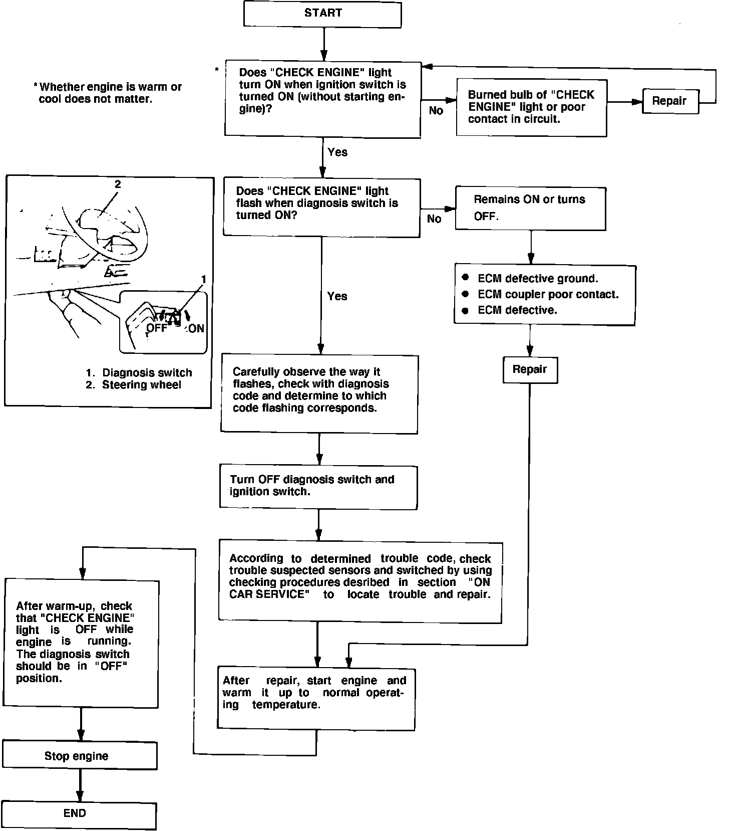The system has a diagnosis switch which is usually set in the ``Off'' position, but when turned on for diagnosis, it indicates the trouble code in the ECM memory by flashing the ``Check Engine'' lamp in a diagnostic code to indicate the area where the malfunctioning devices can be detected.
