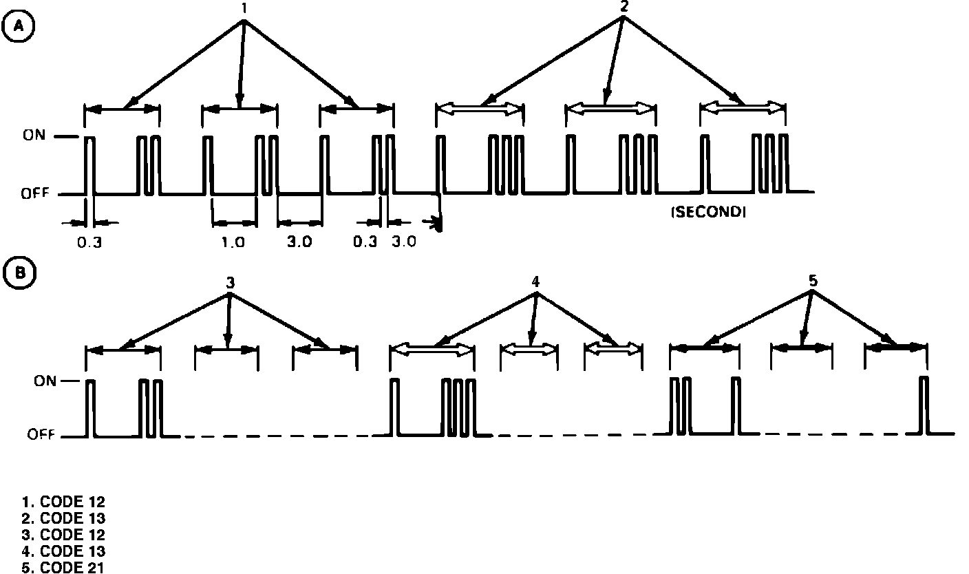 When the ignition switch and the diagnosis switch, Fig. 38, are turned ``On,'' the ``Check Engine'' lamp indicates code 12 three times, then the trouble codes three times each, and continues to cycle between code 12 and the trouble code (13) as shown (A), Fig. 39. Code 12 consists of one flash, a short pause, then two flashes, which indicates the system is functioning properly. The code following code 12 is a trouble code, which means that trouble has occurred in the system to which the particular code corresponds.