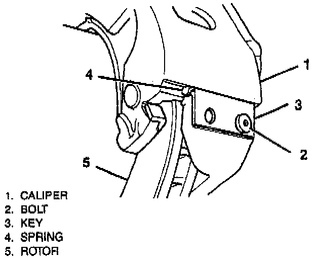 6. Align caliper with steering knuckle abutment surfaces, then insert support key and spring between abutment surfaces at the trailing end of caliper and steering knuckle. With a hammer and brass drift, drive caliper support key and spring into position, then install and torque support key retaining screw to 12---18 ft. lbs.