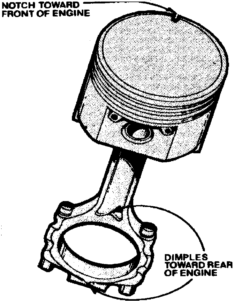 to rod with notch on piston facing toward front of engine and the raised notch side of rod at bearing end facing toward rear of engine,