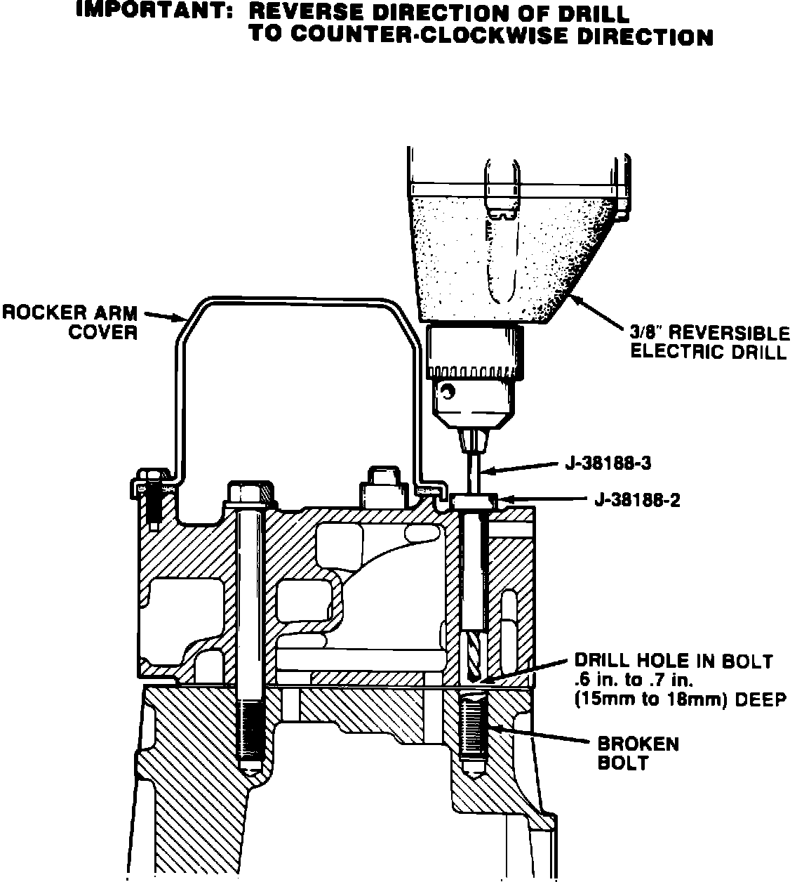 IMPORTANT: TOOL J-38188-3 IS A LEFT-HAND TWIST DRILL - IT IS CRITICAL THAT THE ROTATION OF THE ELECTRIC DRILL BE REVERSED PRIOR TO USING THE DRILL. ROTATION OF THE DRILL SHOULD BE COUNTER-CLOCKWISE.