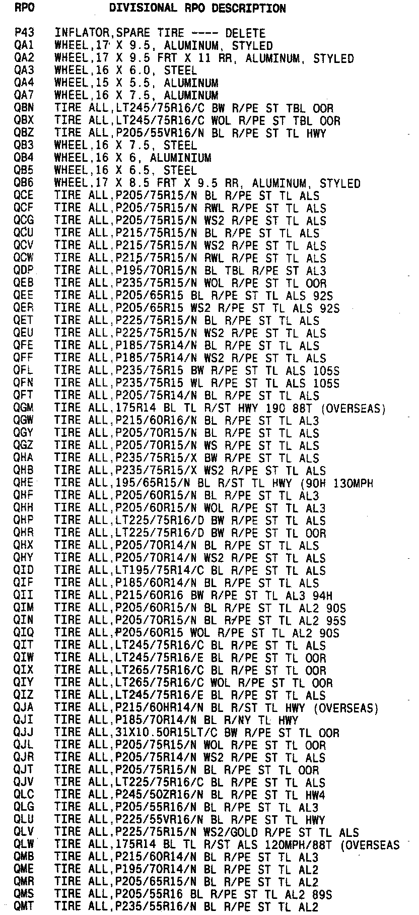 List of Regular Production Option (RPO) Codes