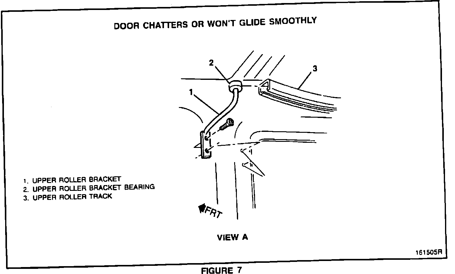 A) The upper roller track is out of adjustment. Reform the upper roller bracket to eliminate any vertical loading on the roller. The roller must not contact the upper or lower portion of the track.