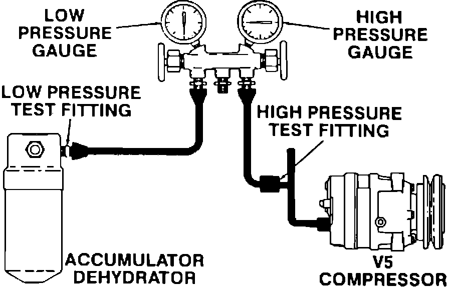 e. Refrigerant system undercharged. This condition may exist when suction pressure is below 35 psi during the high load test. The accumulator (A/D) and the suction line before the A/D, will be warm if charge is low. Add one can of refrigerant and recheck. Pressures should come into white area. If so, find source of refrigerant loss and repair leak. Evacuate and charge system with correct refrigerant amount.