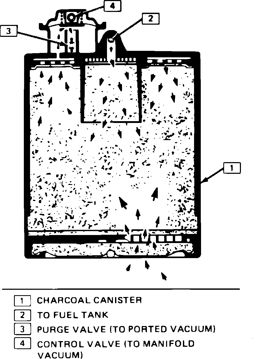 These systems Figs. 65 through 70, transfer fuel vapor from the fuel tank to an activated charcoal canister to hold the vapors when vehicle is not running. When engine is running, fuel vapor is purged from the charcoal canister by intake air flow and consumed during normal combustion. The fuel tank has a non-vented fuel cap and a single vent pipe to the canister.